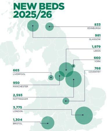 While 27 different markets have seen new beds, the report highlights that just three markets make up nearly half of all new beds (London, Nottingham and Leeds), demonstrating investor focus is limited to major markets where development viability can be delivered.
